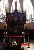 Jak podaje kronika, ołtarz wykonany został z drewna pozostałego po rozebraniu antresoli z naw bocznych. Na mensie spoczywa nastawa ołtarzowa, a na niej tabernakulum, dla którego tłem jest drewniana predella ozdobiona motywami roślinnymi przypominającymi gałązki winogrona z owocami i kwiatami. Motyw ten w symbolice chrześcijańskiej nawiązuje do słów Jezusa: „Ja jestem krzewem winnym, a wy - latoroślami”. Ozdobiona w ten sposób predella jest tłem dla skromnie wykonanego tabernakulum mającego jedynie monogram Jezusa Chrystusa IHS na drzwiczkach. Imię Jezus (IHCOYC) zaczęto skracać do dwóch liter IH. Od IV wieku do liter IH dodawano jeszcze C, na skutek latynizacji skrót IHC przybrał formę rozpowszechnionego zapisu IHS (dawna wymowa słowa Jezus – Ihesus). Tabernakulum w symbolice świątyń chrześcijańskich oznacza namiot (u Hebrajczyków: namiot - ‘Święte’ i ‘Święte Świętych’), w którym spoczywa ciało Chrystusa pod postacią chleba.