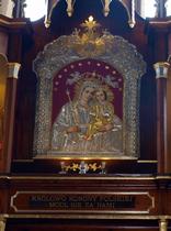 Obraz w ołtarzu głównym przedstawia Matkę Bożą z dzieciątkiem na lewej ręce i berłem w prawej. Na głowy Maryi i Dzieciątka nałożone są korony. Postaci umieszczone są na czerwonym tle, a nad głową Maryi znajduje się dwanaście gwiazd. Pod obrazem widnieje napis: Maryjo Królowo Korony Polskiej módl się za nami. W obrazie Maryja czczona jest jako Królowa, gdyż tym mianem nazywana była od początku IV wieku. Tytuł Maryi Królowej Polski nadał Jej król Jan Kazimierz, kiedy uroczystym aktem 1 kwietnia 1656 roku oddał cały naród pod Jej opiekę. Z kolei papież Jan XXIII ogłosił Najświętszą Maryję Pannę Królową Polski oraz główną Patronką kraju.