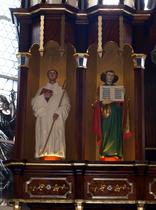 Po prawej i lewej stronie tabernakulum znajdują się dwie postacie – świętego Piotra i świętego Pawła. Rzeźba św. Piotra wykonana jest z drewna. W lewej ręce trzyma on otwartą księgę oraz klucze. Ubrany jest w białą tunikę i złoty, a od wewnątrz zielony, płaszcz. Na głowie ma charakterystyczny lok.