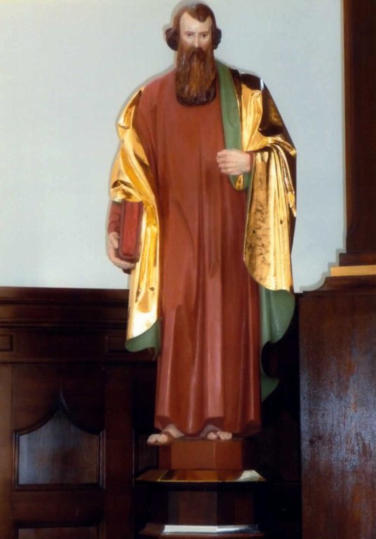 Święty Paweł przedstawiony jest jako mężczyzna o kędzierzawych włosach, z długą brodą. W prawej ręce trzyma zamkniętą księgę (symbol 13 listów Pawłowych), w lewej miecz (symbol męczeństwa apostoła oraz znak głoszonego przez niego Słowa Bożego). Ubrany jest w złoty płaszcz i szarozieloną tunikę, która prawdopodobnie początkowo była zielona.